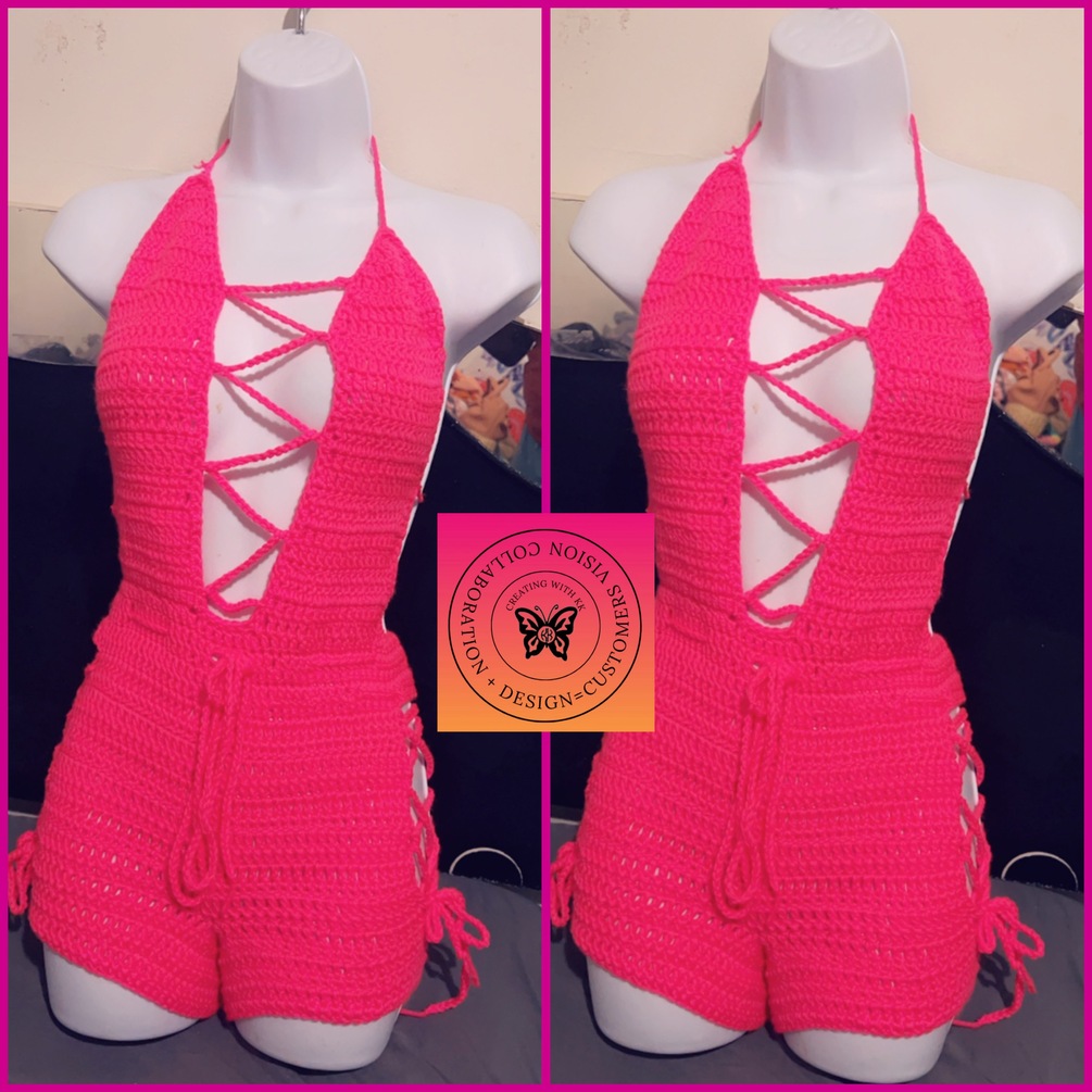 Custom crochet romper with the back out. Please send busy size and hip measurements to keishanaskreations@gmail.com along with order number